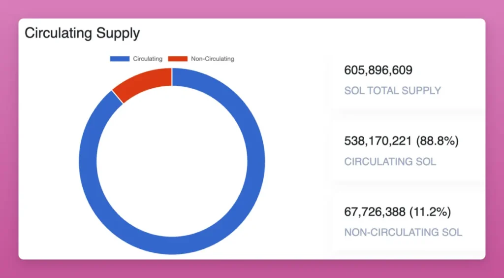 تقریباً ۸۸٪ از عرضه کل سولانا (معادل حدود ۵۳۸.۱۷ میلیون توکن SOL) در گردش است.