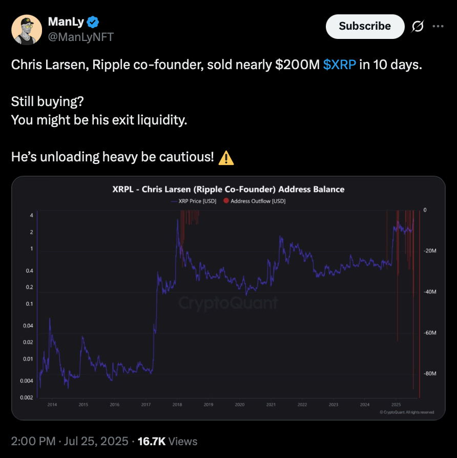 کریس لارسن، همبنیانگذار ریپل، نزدیک به ۲۰۰ میلیون توکن XRP را در ۱۰ روز اخیر فروخت.
