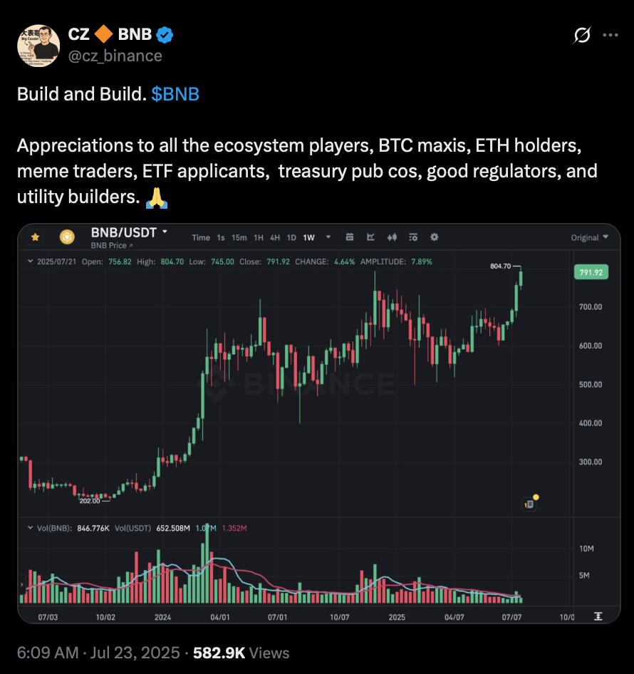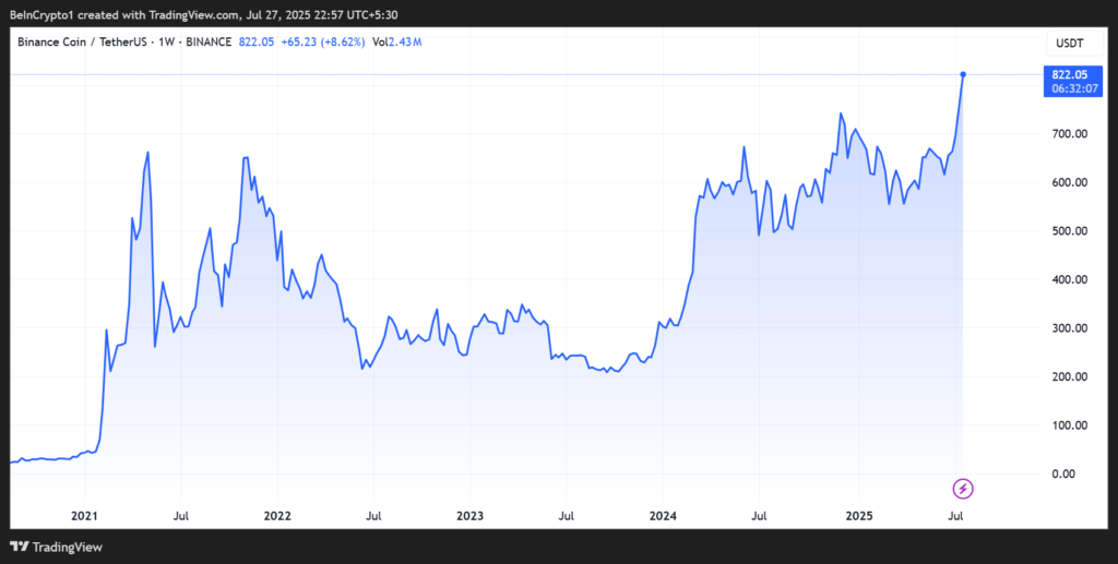 دادههای تریدینگویو (TradingView) نشان میدهد که قیمت BNB در روز یکشنبه ۲۷ جولای (۵ مرداد) به رکورد جدید ۸۲۷.۲۵ دلار رسید.