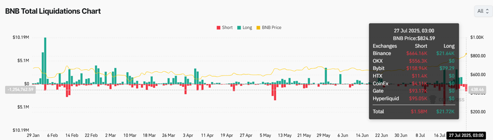 در همین بازه و با رشد قیمت BNB، پوزیشنهای شورت به ارزش ۱.۵۸ میلیون دلار لیکوئید شدند. این در حالی است که میزان لیکوییدیشن پوزیشنهای لانگ تنها ۲۱,۷۲۰ دلار بود.