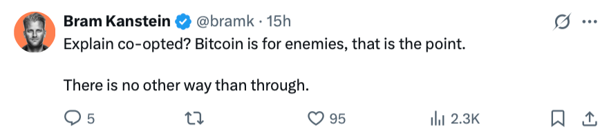 در واکنش به این بحثها، کریپتو مگز (Crypto Mags) یادآور شد که بیتکوین متعلق به همه است، حتی دشمنان، دولتها و والاستریت. او گفت: