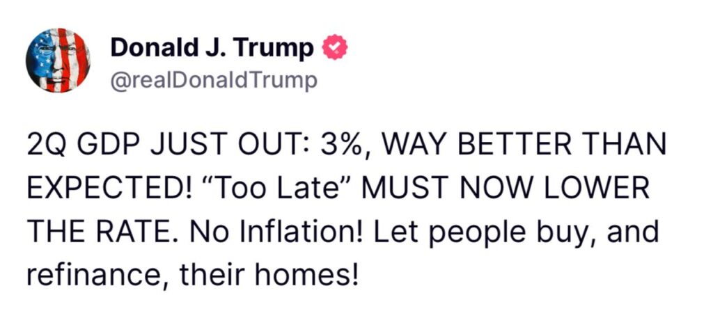 در همین حال، دونالد ترامپ، رییسجمهور آمریکا، بار دیگر خواستار کاهش فوری نرخ بهره شده است. او با انتشار پیامی در پلتفرم تروث سوشال، رشد ۳ درصدی GDP را «بهتر از حد انتظار» توصیف کرده و نوشته است: