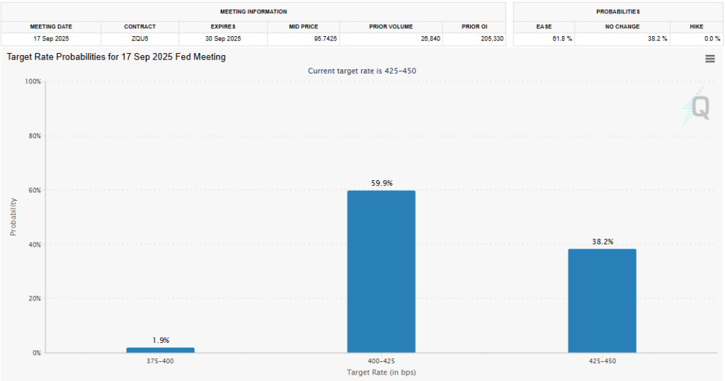 بر اساس دادههای ابزار فدواچ گروه CME، نزدیک به ۶۰٪ احتمال میرود فدرال رزرو در نشست ماه سپتامبر نرخ بهره را ۰.۲۵٪ کاهش دهد.