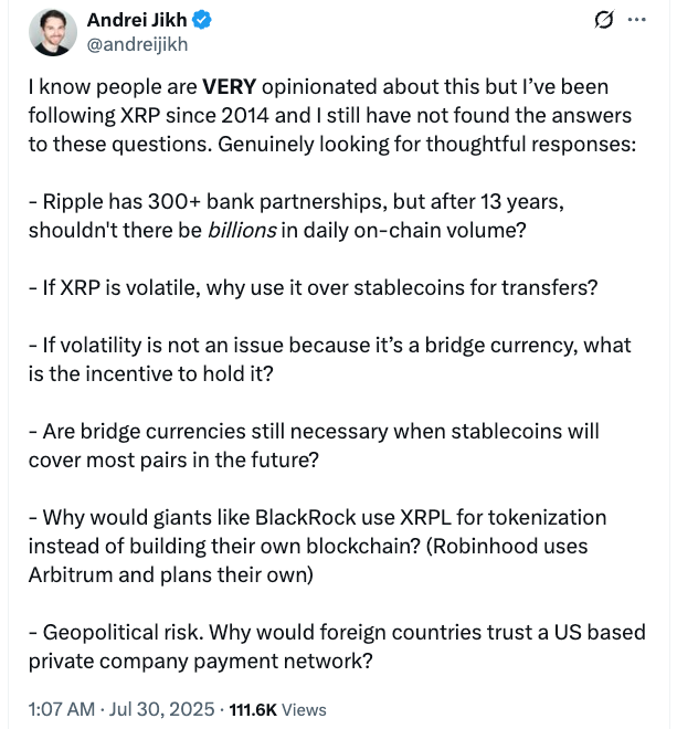 جیک در این توییت با طرح پرسشهایی خواستار ارائه مدارک قابل استناد برای تأیید بیش از ۳۰۰ همکاری بانکی طی سیزده سال فعالیت ریپل شد.