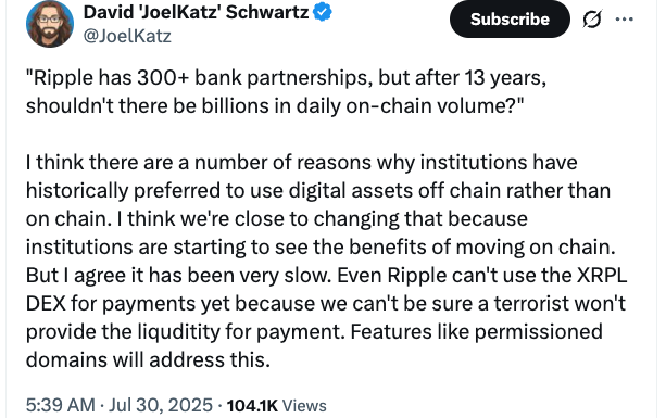 به گفته مدیر ارشد ریپل، مؤسسات مالی بهطور سنتی بنا به دلایل متعددی تمایل بیشتری به استفاده از داراییهای دیجیتال در فضای آفچین داشتهاند. وی همچنین خاطرنشان کرد که حتی خود ریپل نیز از انجام تراکنشهای غیرمتمرکز روی XRPL استفاده نمیکند. او افزود: