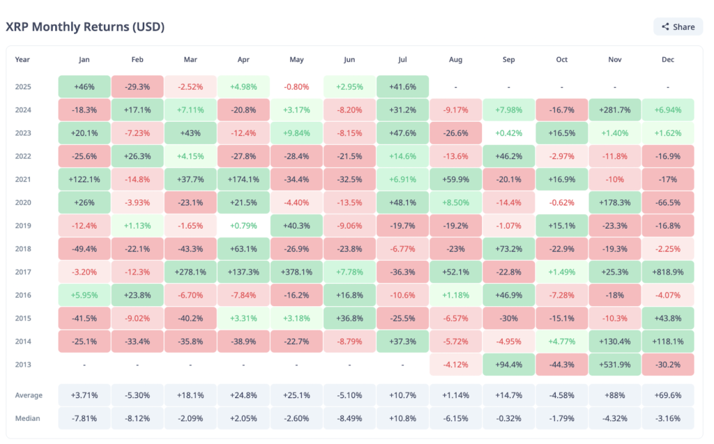 بر اساس دادههای CryptoRank، اگر روند فعلی ادامه پیدا کند، XRP میتواند ششمین ماه جولای متوالی با رشد مثبت را ثبت کند. اگر این اتفاق بیفتد، جولای ۲۰۲۵ با بازدهی ۴۲٪، به سومین ماه جولای موفق در تاریخ عملکرد XRP تبدیل خواهد شد.