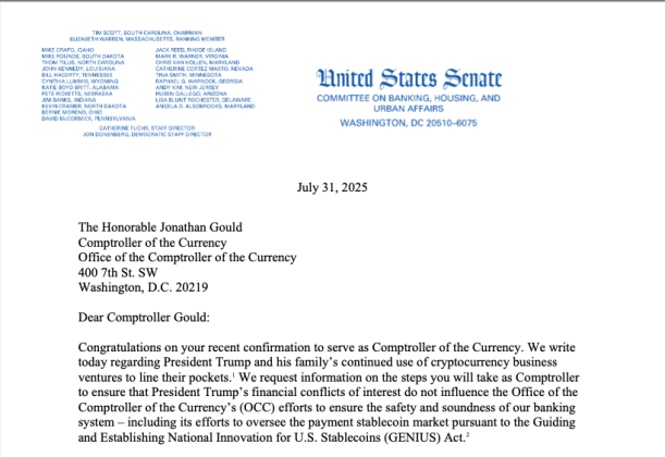 روز پنجشنبه، الیزابت وارن (Elizabeth Warren)، کریس ون هولن (Chris Van Hollen) و ران وایدن (Ron Wyden)، سه سناتور معروف حزب دموکرات، نامهای خطاب به جاناتان گولد (Jonathan Gould)، رییس تازهتاییدشده اداره OCC ارسال کردند. این اقدام پس از تصویب قانون جدیدی صورت گرفته که چارچوب قانونی تازهای برای فعالیت استیبلکوینها در آمریکا تعیین میکند.