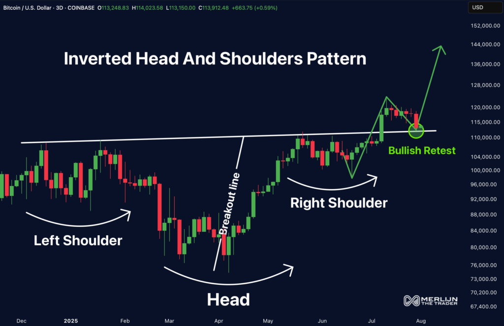 بازآزمایی موفق خط گردن، اکنون نشان میدهد که بیت کوین احتمالاً وارد فاز ادامهدار روند صعودی خود شده است. در این سناریو، هدف قیمتی الگوی سر و شانه معکوس، رسیدن به محدوده ۱۴۸٬۲۵۰ دلار خواهد بود.