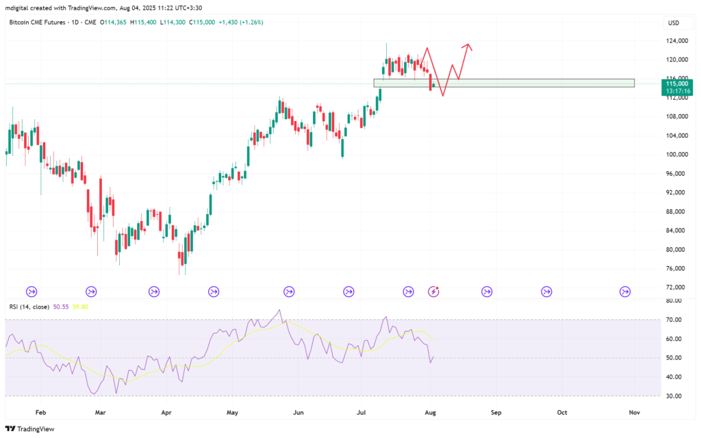گپ CME بین ناحیه ۱۱۴ تا ۱۱۵ هزار دلار نیز کاملا پر شد و محدوده ۱۱۲ هزار دلار بهخوبی به برگشت قیمت پاسخ داد. از این نظر، نگرانی چندانی نداریم؛ چرا که گپ بعدی در محدوده بسیار پایینتری قرار دارد.