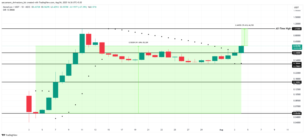 اگر جو بازار به سمت فشار فروش تغییر کند، ممکن است MemeCore نتواند این روند را ادامه دهد. در این صورت، شکست سطح حمایتی ۰.۴۴۰ دلار ممکن است قیمت را وارد یک دوره تثبیت کند و حتی آن را به محدوده ۰.۲۹۸ دلار نزدیک کند. چنین سناریویی نشانهای از تضعیف موقت در چشمانداز صعودی این توکن خواهد بود.