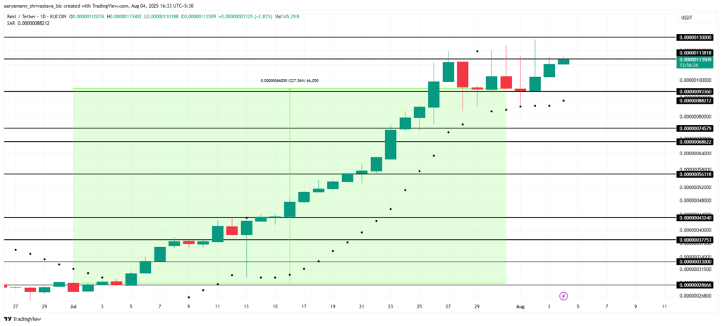 توکن رکت در ماه جولای با ۲۲۱٪ رشد در کانون توجهات قرار گرفت. این میم کوین در حال حاضر با قیمت ۰.۰۰۰۰۰۱۱۶۷ دلار معامله میشود و سیگنالهای تکنیکال نشان از ادامهدار بودن روند صعودی دارد.