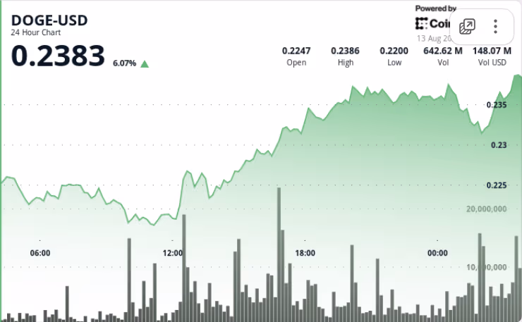 - دوج کوین از ۱۲ تا ۱۳ آگوست (۲۱ تا ۲۲ مرداد)، ۵.۶٪ رشد کرد و از ۰.۲۲۵ دلار به ۰.۲۳۳ دلار رسید.