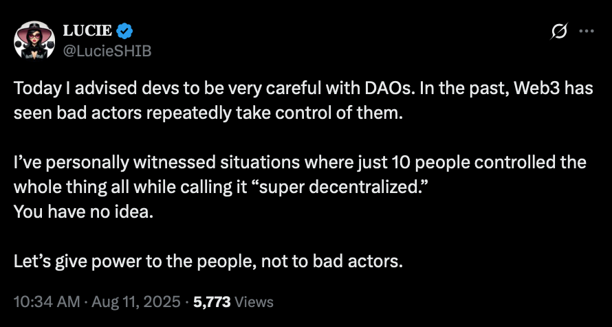 لوسی از اعضای جامعه SHIB خواست تا نسبت به کلاهبرداریهای مرتبط با سازمانهای مستقل غیرمتمرکز (DAO) هوشیار باشند و به توسعهدهندگان هشدار داد که در تعامل با چنین سازمانهایی دقت ویژهای داشته باشند، چرا که در گذشته افراد سودجو بارها کنترل این ساختارها را در دست گرفتهاند.