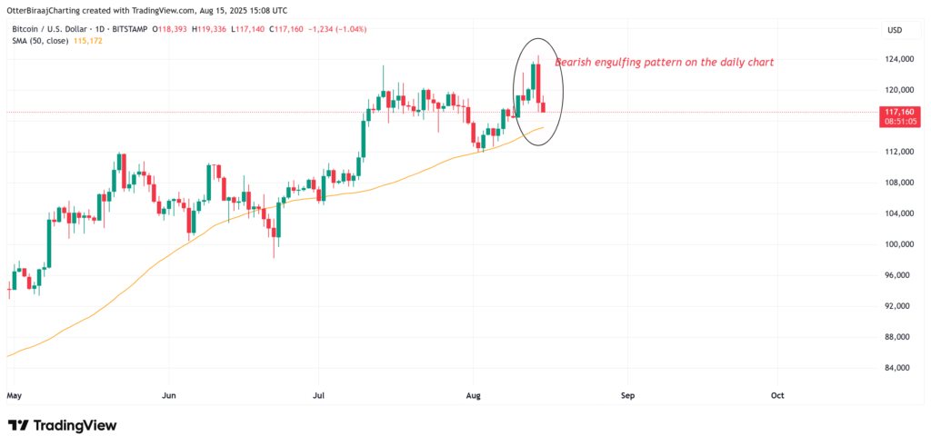 بیت کوین روز پنجشنبه با اصلاح شدید مواجه شد و با سقوط به زیر ۱۱۷٬۰۰۰ دلار، بزرگترین عقبنشینی خود طی یک ماه گذشته را تجربه کرد. نمودار روزانه برای نخستین بار از ۱۵ جولای (۲۴ تیر) الگوی نزولی اینگالفینگ (Engulfing) را نشان داد که نگرانیها را نسبت به احتمال تداوم تضعیف قیمت در دوره موسوم به «ماه ارواح» در آسیا (Ghost Month) افزایش داده است.