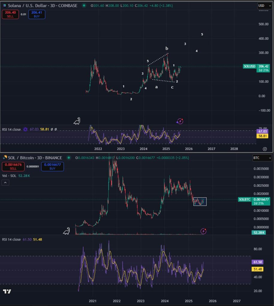 این تحلیلگر همچنین پیشبینی کرد که سولانا در نمودار سهروزه خود در برابر بیت کوین، آماده یک شکست صعودی است؛ چرا که پیشتر یک الگوی سهموجی نزولی را تکمیل کرده است.