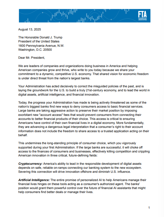 در این نامه هشدار داده شده که بانکهای بزرگ برای حفظ جایگاه خود در بازار و جلوگیری از رقابت، قصد دارند از ماه سپتامبر کارمزدهای سنگینی تحت عنوان «کارمزد دسترسی به حسابها (Account Access Fees)» دریافت کنند. این کارمزدها عملاً مانع اتصال حسابهای بانکی مشتریان به سرویسهای نوآورانهای میشود که توسط شرکتهای فینتک و پلتفرمهای رمزارزی ارائه میشوند.