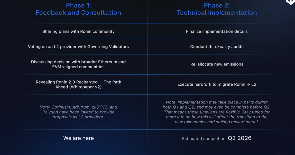 طبق برنامهریزی، مهاجرت کامل رونین از یک بلاکچین لایه ۱ به لایه ۲ اتریوم تا سهماهه دوم سال ۲۰۲۶ انجام خواهد شد.