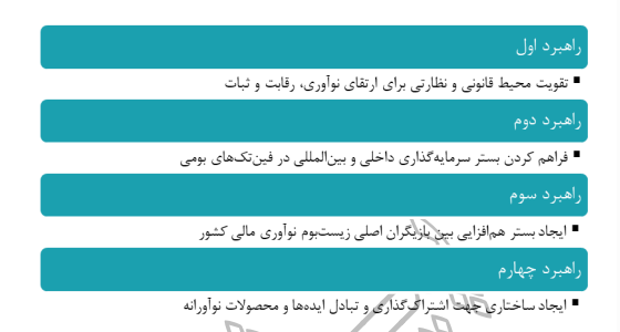 - راهبرد سوم: ایجاد بستر همافزایی بین بازیگران اصلی زیستبوم نوآوری مالی کشور