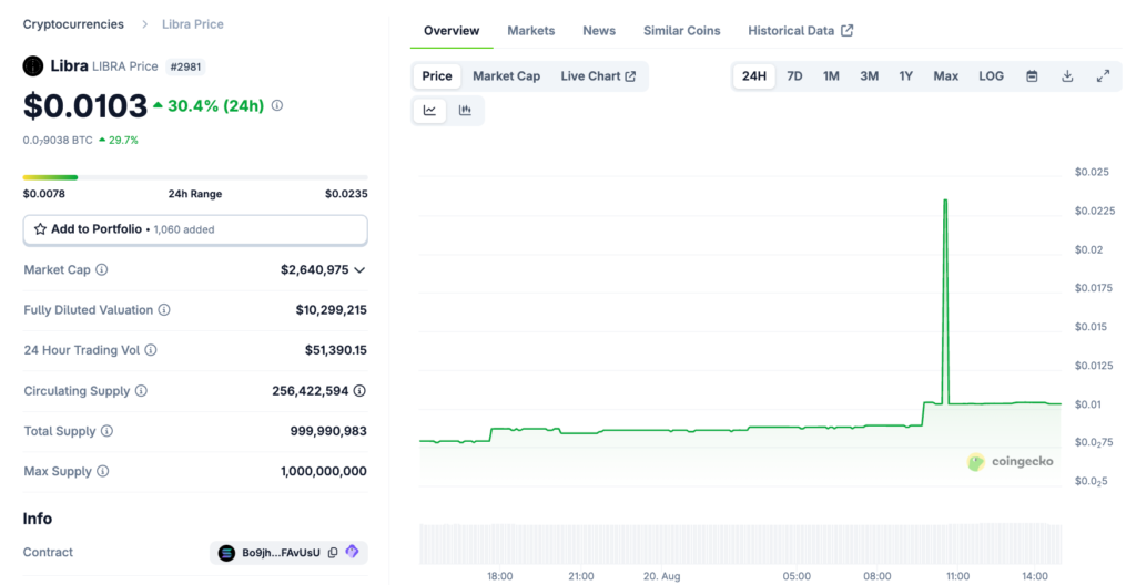 انتشار این خبر باعث شد توکن LIBRA بهطور موقت رشد کند، اما خیلی زود دوباره سقوط کرد.