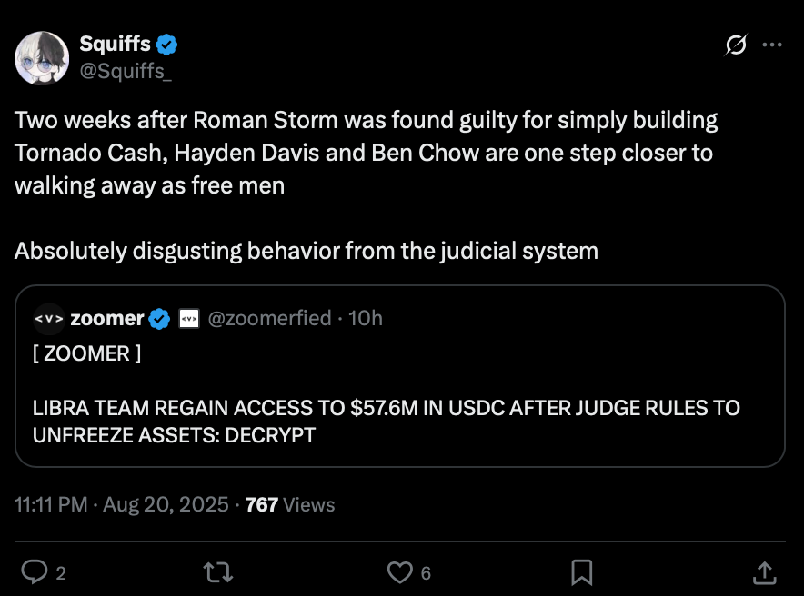 در همین حال، نارضایتی جامعه کریپتو بهویژه پس از صدور حکم محکومیت رومن استورم (Roman Storm) افزایش یافته است. عبارت «جرم حالا قانونی است» بارها توسط کاربران و تحلیلگران تکرار شد؛ چراکه بسیاری با ناباوری به روند این پرونده نگاه میکنند.