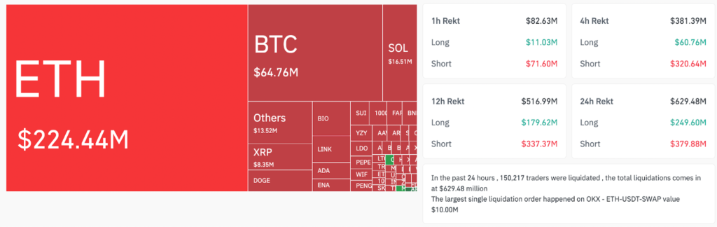 در مجموع، همانطور که در نمودار دیده میشود، ۶۲۹.۴۸ میلیون دلار از پوزیشنهای لانگ و شورت در بازار حذف شد. این بازیابی ناگهانی بازار منجر به لیکویید شدن ۱۵۰٬۲۱۷ معاملهگر شد و بسیاری را غافلگیر کرد، زیرا احساسات سرمایهگذاران به سرعت صعودی شد.