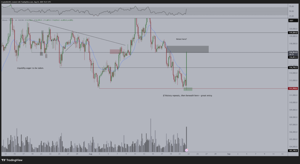 مایکل فان دپوپه (Michael van de Poppe)، بنیانگذار MN Capital، گفت که ریزش بیت کوین به زیر ۱۱۲٬۰۰۰ دلار موقعیت ورود خوبی در اختیار معاملهگران قرار داد. او اوایل هفته به دنبالکنندگانش در ایکس هشدار داده بود که محدوده زیر کف سوم آگوست (۱۱۱٬۹۰۰ دلار) یک نقطه مناسب برای انباشت است.