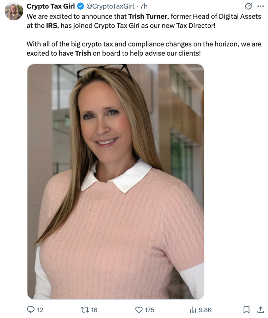 براساس گزارش بلومبرگ تَکس، او در مصاحبهای اعلام کرد که بهعنوان مدیر بخش مالیات به شرکت کریپتو تکس گرل (Crypto Tax Girl) خواهد پیوست؛ این شرکت در زمینه مشاوره و خدمات مالیاتی حوزه ارزهای دیجیتال فعال است. همزمان، لورا والتر (Laura Walter) – بنیانگذار این شرکت – نیز در پستی در لینکدین تأیید کرد که ترنر به تیم آنها ملحق میشود. والتر نوشت: