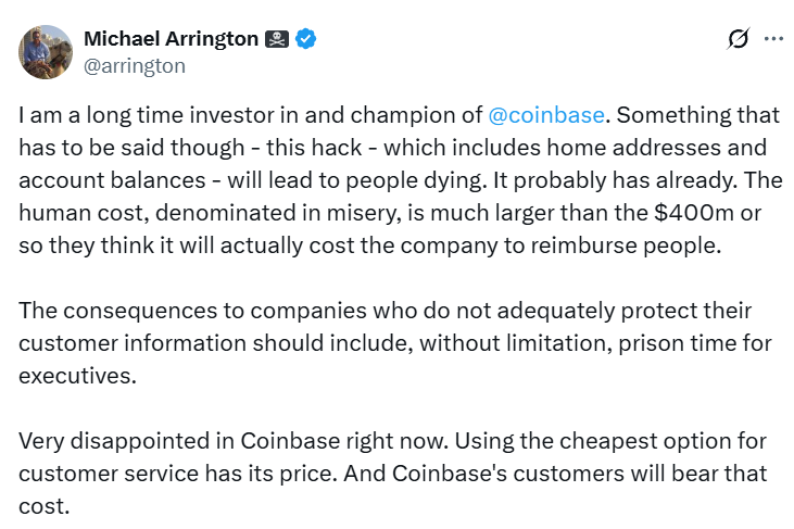 اما به گفته مایکل آرینگتون (Michael Arrington) – بنیانگذار تککرانچ (TechCrunch) و شرکت آرینگتون کپیتال (Arrington Capital) – خسارات انسانی این رخنه ممکن است به مراتب بیشتر باشد. او هشدار داده بود که دادههای فاششده شامل نشانی محل سکونت و موجودی حساب کاربران بوده و همین مسئله خطر حملات فیزیکی علیه افراد را افزایش میدهد.