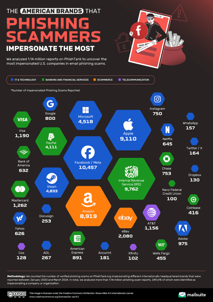 در مقایسه با برندهای بزرگ ایالات متحده، شرکت متا (Meta) بیشترین میزان جعل هویت را تجربه کرده است. طبق دادههای این گزارش، در چهار سال گذشته نام متا دستکم در ۱۰,۴۵۷ کلاهبرداری گزارششده مورد سوءاستفاده قرار گرفته است. اداره مالیات داخلی آمریکا (IRS) نیز با دستکم ۹,۷۶۲ مورد جعل هویت، دومین هدف اصلی کلاهبرداران بوده است.