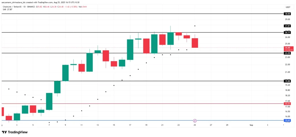 قیمت چین لینک حدوداً ۲۳.۲۶ دلار است و در مسیر نزولی قرار دارد. شاخص پارابولیک سار (Parabolic SAR) که بالای کندلها قرار گرفته است، سیگنالی از ادامه فشار فروش ارائه میدهد. با این حال، در صورت ورود محرکهای مثبت یا بهبود احساسات سرمایهگذاران، امکان بازگشت روند وجود دارد.