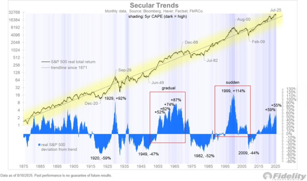 فراتر از نقدینگی و بازتامین مالی، چرخههای بلندمدت بازار نیز اهمیت دارند. نشریه The Kobeissi Letter با استفاده از مدل CAPE (نسبت قیمت به درآمد تعدیلشده چرخهای)، نشان میدهد که بازار صعودی بلندمدت (Secular Bull Market) فعلی در سال ۲۰۰۹ آغاز شده و تاکنون ۱۶ سال به طول انجامیده است. چرخه ۱۹۸۲-۲۰۰۰ قبل از پایان یافتن با سقوط دات-کام، ۱۱۴٪ رشد کرد، در حالی که دوره ۱۹۴۹-۱۹۶۸ شاهد سقفهای کوچکتر و اصلاحهای عمیقتر در نزدیکی پایان خود بود.