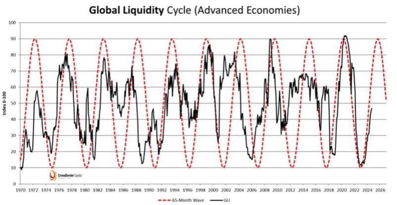 با این حال، نقدینگی نیز همانطور که شاخص نقدینگی جهانی هاول نشان میدهد، در چرخههایی حرکت میکند. این شاخص در دسامبر ۲۰۲۲ به کف خود رسید و اکنون به اوج خود تا اواخر سال ۲۰۲۵ اشاره دارد. از نظر تاریخی، اوجهای نقدینگی اغلب پیش از نوسانات شدید رخ میدهند؛ با انقباض تأمین مالی پس از آن، نرخهای بازار پول میتوانند جهش کنند و سرمایهگذاران شروع به فروش داراییهای پرریسک خود میکنند.