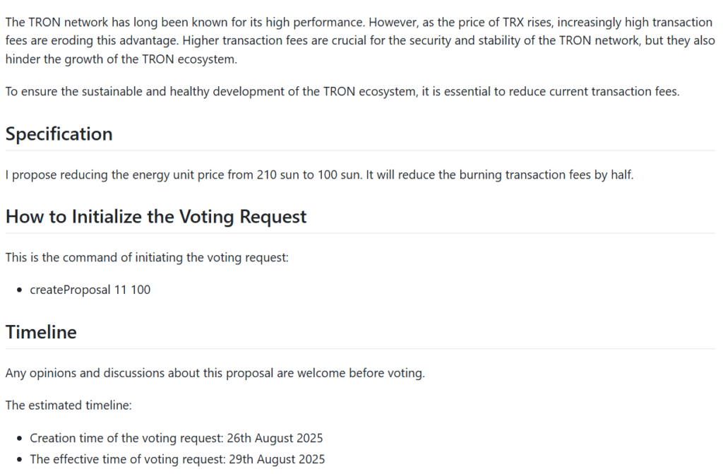 این پروپوزال با عنوان کاهش کارمزدهای تراکنش (مسئله شماره ۷۸۹)، در تاریخ ۸ آگوست توسط کاربر گیتهاب GrothenDI در مخزن پروپوزالهای بهبود ترون (Tron Improvement Proposals) ثبت شد.