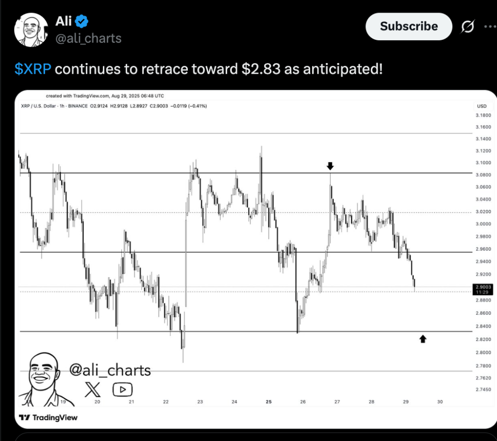 اگر این الگو در سپتامبر تکرار شود، قیمت ریپل میتواند به سمت EMA 50 هفتهای در محدوده ۲.۱۷ دلار حرکت کند که معادل افتی حدود ۲۵٪ خواهد بود.