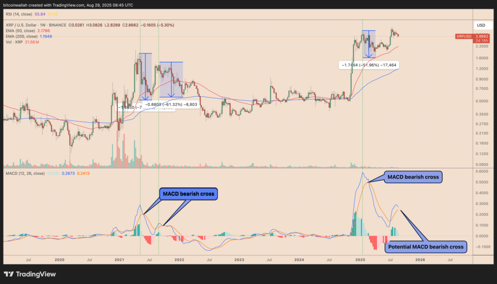 در چرخههای گذشته ریپل، چنین کراسهایی آغازگر اصلاحهای ۵۰ تا ۶۰ درصدی بودهاند. بهعنوان مثال، در می ۲۰۲۱، سپتامبر ۲۰۲۱ و مارس ۲۰۲۵، کراس نزولی MACD درست پس از اوجگیری قیمت شکل گرفت.