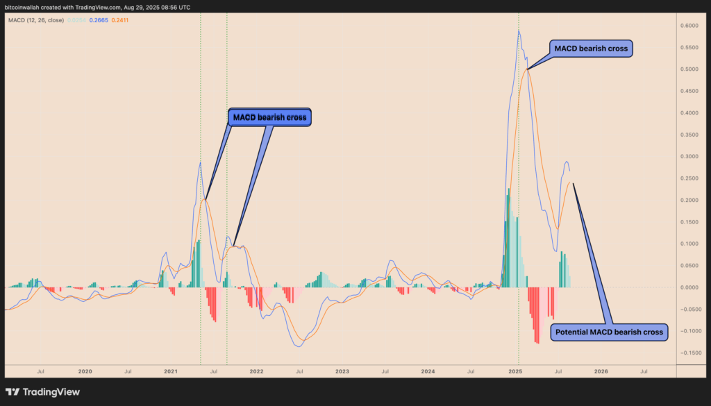 در نمودار هفتگی، اندیکاتور همگرایی-واگرایی میانگین متحرک (MACD) که تغییرات قدرت روند را اندازهگیری میکند، در مسیر ثبت یک «کراس نزولی» در سپتامبر است.
