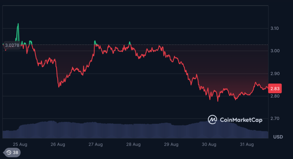 ریپل در بازه ۲۴ ساعته از ۳.۰۲ تا ۲.۸۹ دلار افت کرد که معادل کاهش ۴.۳٪ در محدودهای به اندازه ۰.۱۷ – بین سقف ۳.۰۲ و کف ۲.۸۵ دلار – بود. سنگینترین فروش در روز ۲۸ آگوست (۶ شهریور) اتفاق افتاد؛ در این زمان قیمت به ۲.۷۷ دلار افت کرد و حجم معاملات به ۹۶.۱۹ میلیون (بیش از دو برابر میانگین روزانه) رسید.