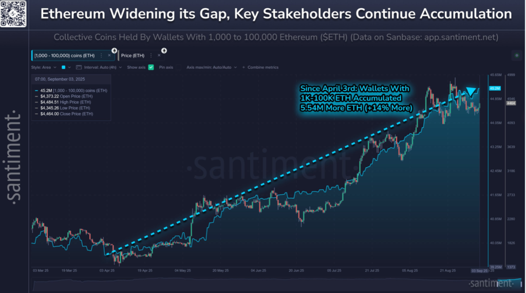 به گزارش میهن بلاکچین، در طول پنج ماه گذشته، آدرسهایی که بین ۱,۰۰۰ تا ۱۰۰,۰۰۰ واحد ETH در اختیار دارند ذخایر خود را ۱۴٪ افزایش دادهاند. این میزان معادل ۴.۴۱ تا ۴۴۰.۸۱ میلیون دلار دارایی در قیمتهای کنونی است.