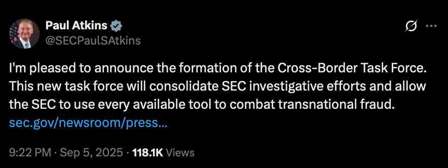 در مراحل اولیه، این کارگروه به بررسی موارد دستکاری بازار مرتبط با شرکتهایی خواهد پرداخت که عمدتاً در حوزههای قضایی مانند چین فعالیت میکنند؛ در این فضا، اجرای قوانین حمایتی از سرمایهگذاران با چالشهای بیشتری همراه است. پل اس. اتکینز (Paul S. Atkins) – رئیس SEC – با تأکید بر اهمیت این اقدام اعلام کرد: