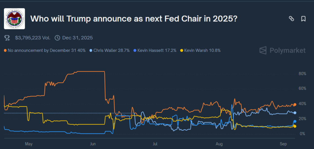 طبق پیشبینیها، احتمال انتخاب کوین هَست بهعنوان رییس فدرال رزرو ۱۷.۲٪ و احتمال انتخاب کوین وارش ۱۰.۸٪ است. همچنین ۴۰٪ احتمال وجود دارد که ترامپ تا پایان سال جانشین پاول را معرفی نکند.
