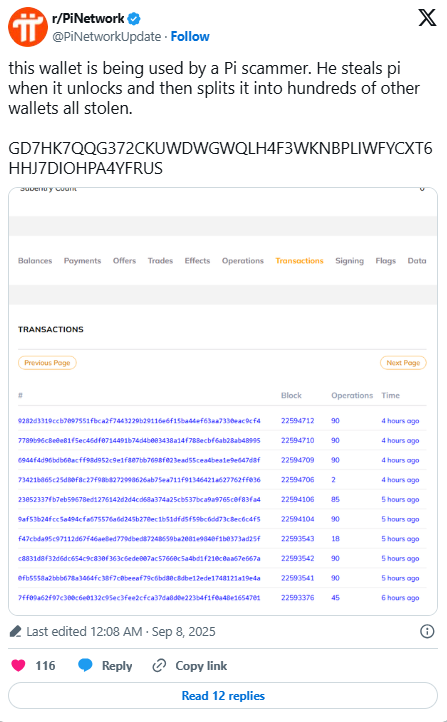 یکی از مدیران انجمن پای نتورک در پستی در شبکه اجتماعی ایکس کیف پولی مشکوک را معرفی کرده که به ادعای او توسط یک کلاهبردار مورد استفاده قرار گرفته است. بر اساس توضیحات این مدیر، فرد کلاهبردار از فرصت آنلاک حسابها سوءاستفاده کرده و با دسترسی به دارایی کاربران، توکنهای پای آنها را به سرفت برده است. سپس این شخص همچنین داراییهای مسروقه را میان چندین کیف پول کوچکتر توزیع کرده تا ردگیری آنها سختتر شود.