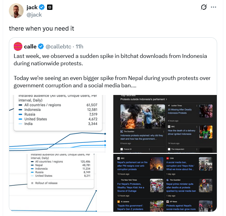 هزاران شهروند نپالی در پی اعتراضات گسترده علیه فساد دولتی و مسدود شدن شبکههای اجتماعی، به اپلیکیشن پیامرسان غیرمتمرکز بیتچت (Bitchat) روی آوردند. این اپلیکیشن توسط جک دورسی (Jack Dorsey) – مدیرعامل بلاک (Block) و بنیانگذار توییتر سابق – راهاندازی شده است.