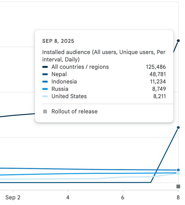 هفته گذشته شاهد جهش چشمگیر دانلودها از اندونزی بودیم و امروز افزایش بسیار بیشتری از نپال مشاهده میکنیم؛ درست در زمانی که اعتراضات جوانان علیه فساد دولتی و ممنوعیت شبکههای اجتماعی اوج گرفته است.