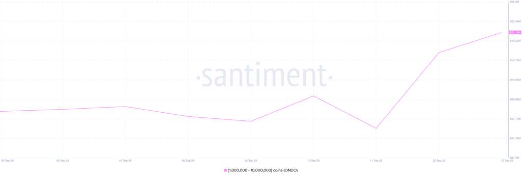 توکن بومی سازمان غیرمتمرکز آندو دائو (Ondo DAO) – با نماد ONDO – در هفته گذشته یکی از انتخابهای اصلی نهنگهای بازار بود. دادههای آنچین نشان میدهد از تاریخ ۵ سپتامبر (۱۴ شهریور) تاکنون، دارندگان بزرگ با کیف پولهایی بین ۱ تا ۱۰ میلیون توکن، مجموعاً ۲۳.۷۳ میلیون ONDO را به سبد خود اضافه کردهاند.