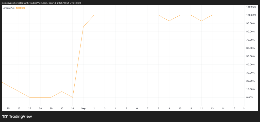 بررسی شاخصهای مومنتوم در نمودار یکروزه جفتارز PUMP/USD نیز این چشمانداز صعودی را تأیید میکند. بهعنوان مثال، شاخص آرون آپ (Aroon Up) در سطح ۱۰۰٪ قرار دارد که نشاندهنده قدرت بالای روند صعودی است.