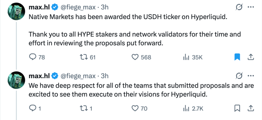 مکس فیج (Max Fiege) – بنیانگذار Native Markets – اعلام کرد که این پروژه طی روزهای آینده اولین پیشنهاد بهبود هایپرلیکویید (HIP) برای USDH و همچنین یک توکن ERC-20 روی شبکه اتریوم را راهاندازی خواهد کرد. او پستی در شبکه اجتماعی X منتشر کرد و توضیح داد که گام بعدی آغاز فاز آزمایشی برای فرایند صدور و بازخرید توکنهاست.