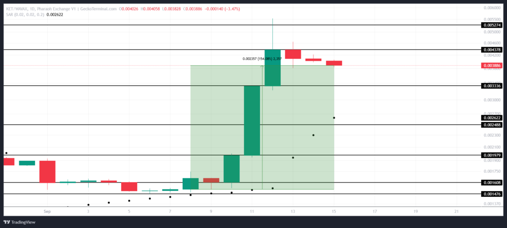 قیمت کِت (KET) در یک هفته ۱۵۴٪ افزایش یافته و در حال حاضر روی ۰.۰۰۳۸ دلار قرار دارد. شاخص پارابولیک سار (Parabolic SAR) زیر نمودار قیمت است و نشان میدهد که روند صعودی هنوز ادامه دارد؛ به همین دلیل، سرمایهگذاران منتظر حرکت بعدی این توکن هستند.