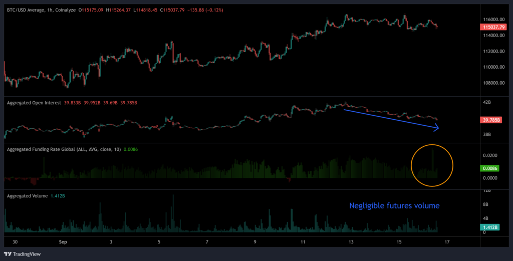 نرخ فاندینگ ریت، که هزینه نگهداری پوزیشنها در قراردادهای آتی دائمی را نشان میدهد، نیز روند نزولی داشته است. در جلسه معاملاتی لندن در روز سهشنبه، بالاترین جهش ساعتی نرخ تأمین مالی از ۱۴ آگوست (۲۳ مرداد) تاکنون ثبت شد که با رسیدن قیمت بیت کوین به سقف محلی خود همزمان بود.