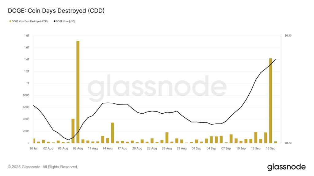 در روزهای اخیر، موجودی دوج کوین در صرافیها به طور چشمگیری افزایش یافته است. از ابتدای سپتامبر تاکنون حدود ۵.۸۱ میلیارد واحد DOGE (به ارزش بیش از ۱.۶۳ میلیارد دلار) به صرافیها منتقل شده است؛ این موضوع نشاندهنده آن است که بخش قابلتوجهی از سرمایهگذاران خود را برای فروش آماده کردهاند.