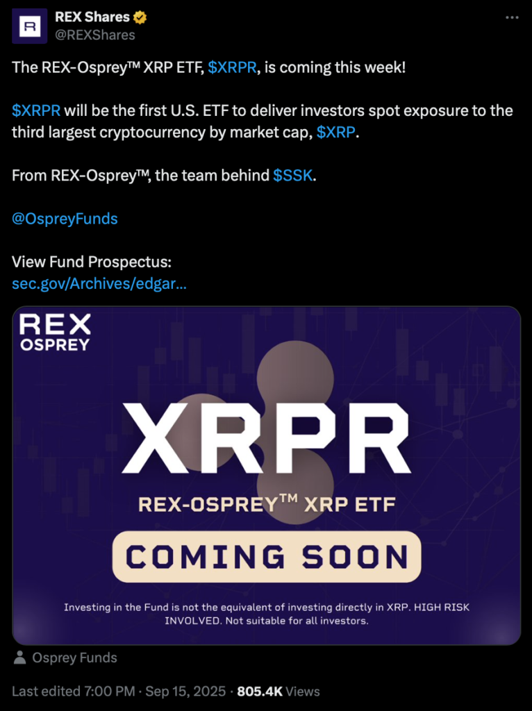 عامل مهم دیگر که میتواند به رشد ریپل شتاب بدهد، راهاندازی صندوق ETF اسپات ریپل به نام رکسآسپری (REX-Osprey) با نماد XRPR است. این صندوق به همراه صندوق مرتبط با دوج کوین پس از پایان دوره بررسی ۷۵ روزه توسط کمیسیون بورس و اوراق بهادار آمریکا (SEC) بدون مخالفت، امروز در بازارهای آمریکا آغاز به کار میکند.